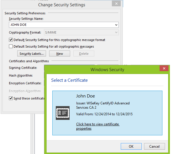 In the Change Security Settings, Choose your Personal Certificate (Signing Certificate) -> OK