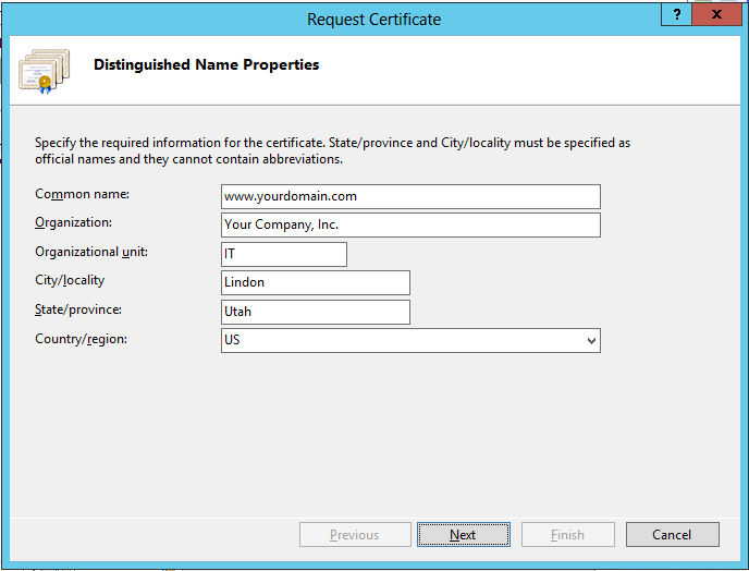 In the "Distinguished Name Properties" window, enter the information as follows: