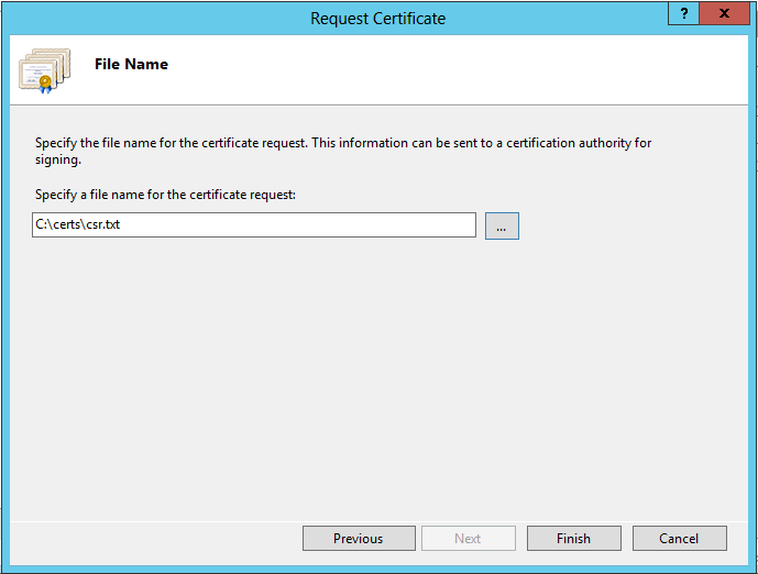 Click the ... box to browse to a location where you want to save the CSR file. If you just enter a filename without browsing to a location, your CSR will end up in C:\Windows\System32.