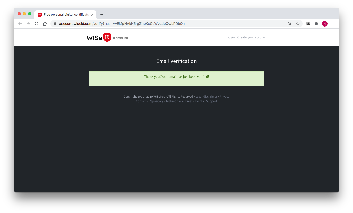 Click on "Verify your email" button in WISeKey's WISeID Account Verification Email that you received to complete verification process.