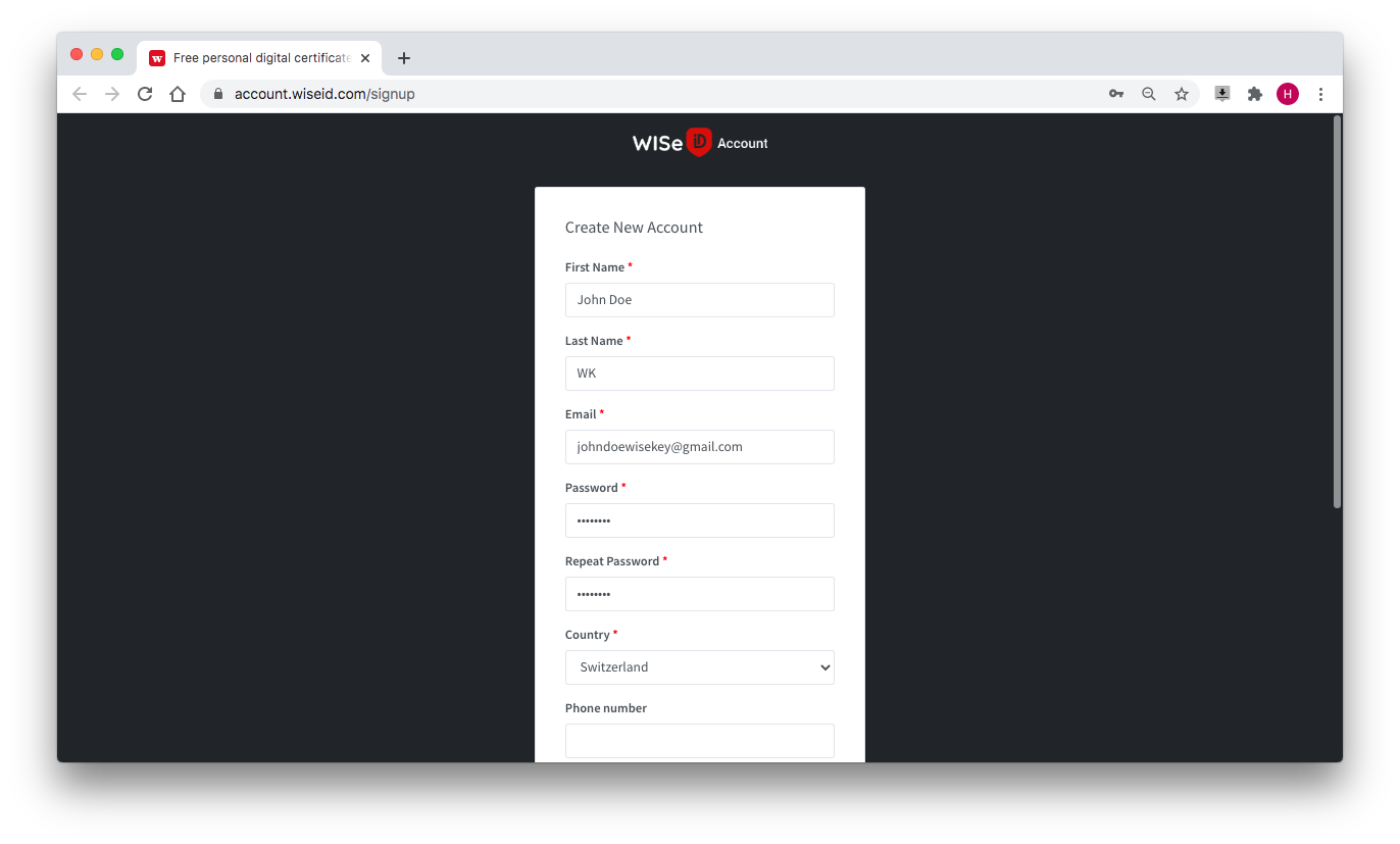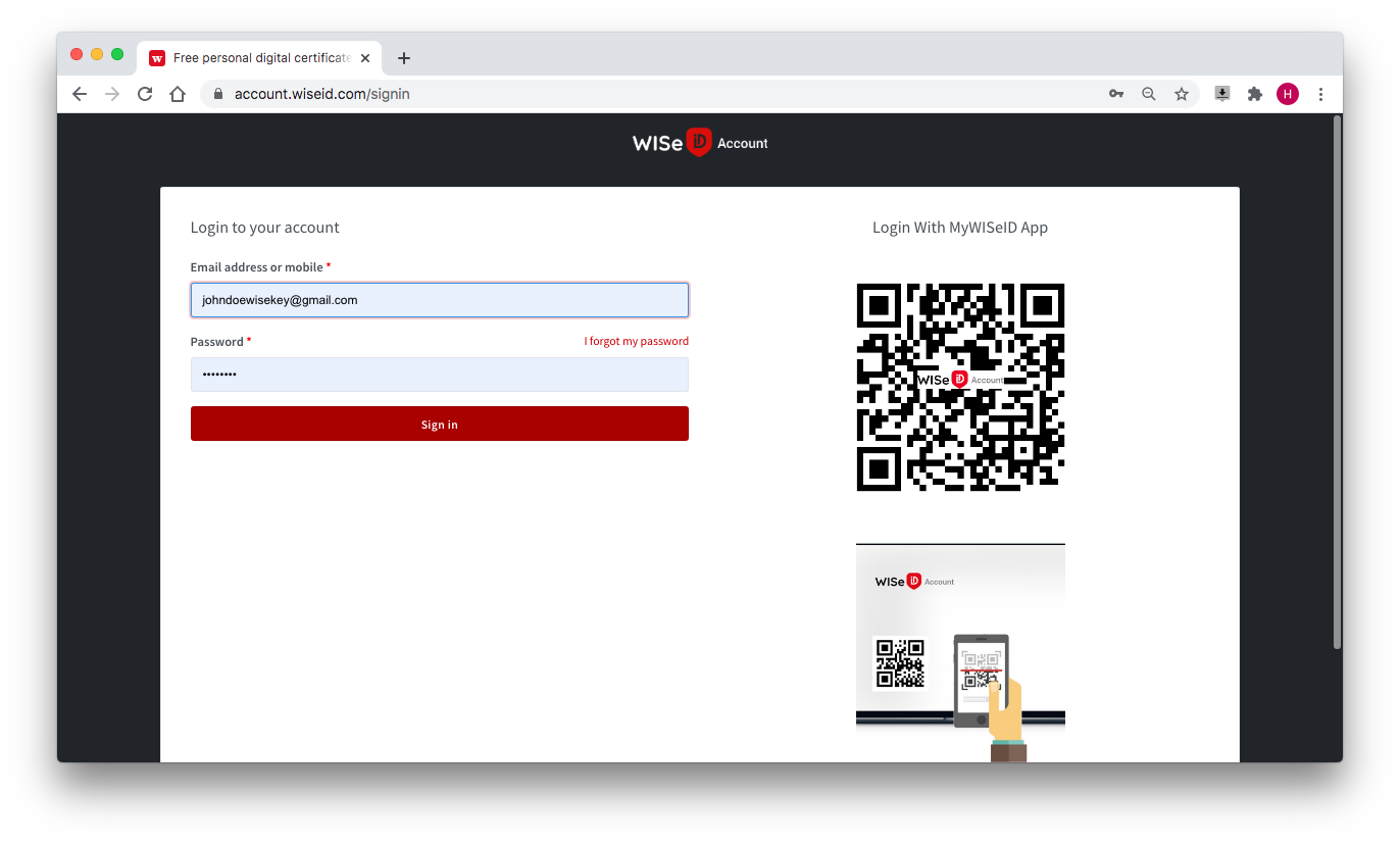 In order to login to the WISeKey WISeID Account, it is required to enter email and password in the sign-in page: https://account.wiseid.com/signin