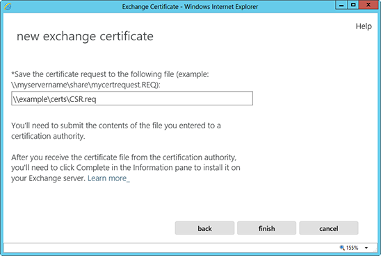 Enter a network share path to save the CSR to your computer as a .req file, then Finish.