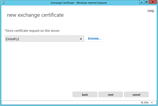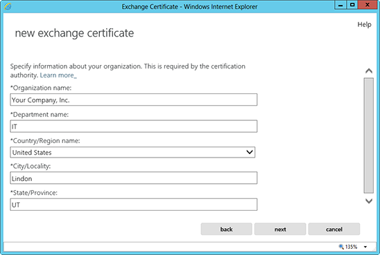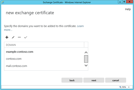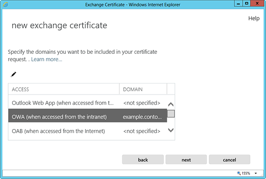 At the next screen, you will be able to review a list of the names which Exchange 2013 suggests you include in your certificate request.